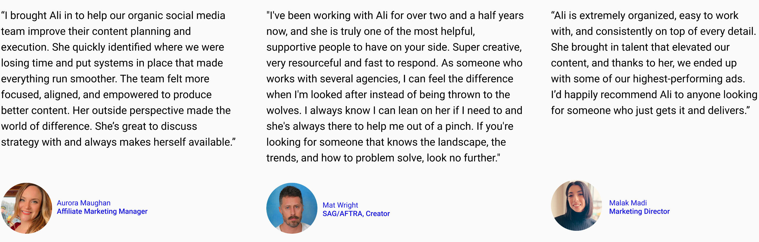 Specializing in both direct response and brand marketing, I’ve worked with fast-growing brands and agencies across a large variety of niches—managing the complexities of multi-team workflows, approval processes, and high-volume creative production to ensure seamless execution and impactful results.